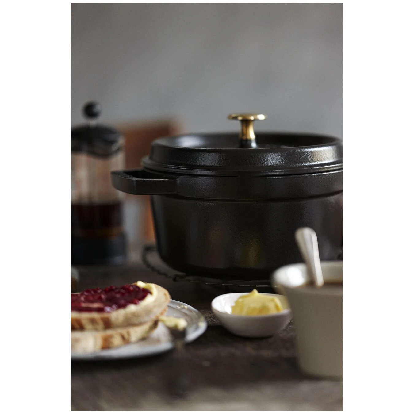 A STAUB La Cocotte can be used to prepare a wide variety of casseroles and roasted dishes. This round, black cast iron roasting pan keeps heat inside so that less energy is used while cooking and has a 1.7l capacity, a height of 13cm and a base diameter of 18cm.