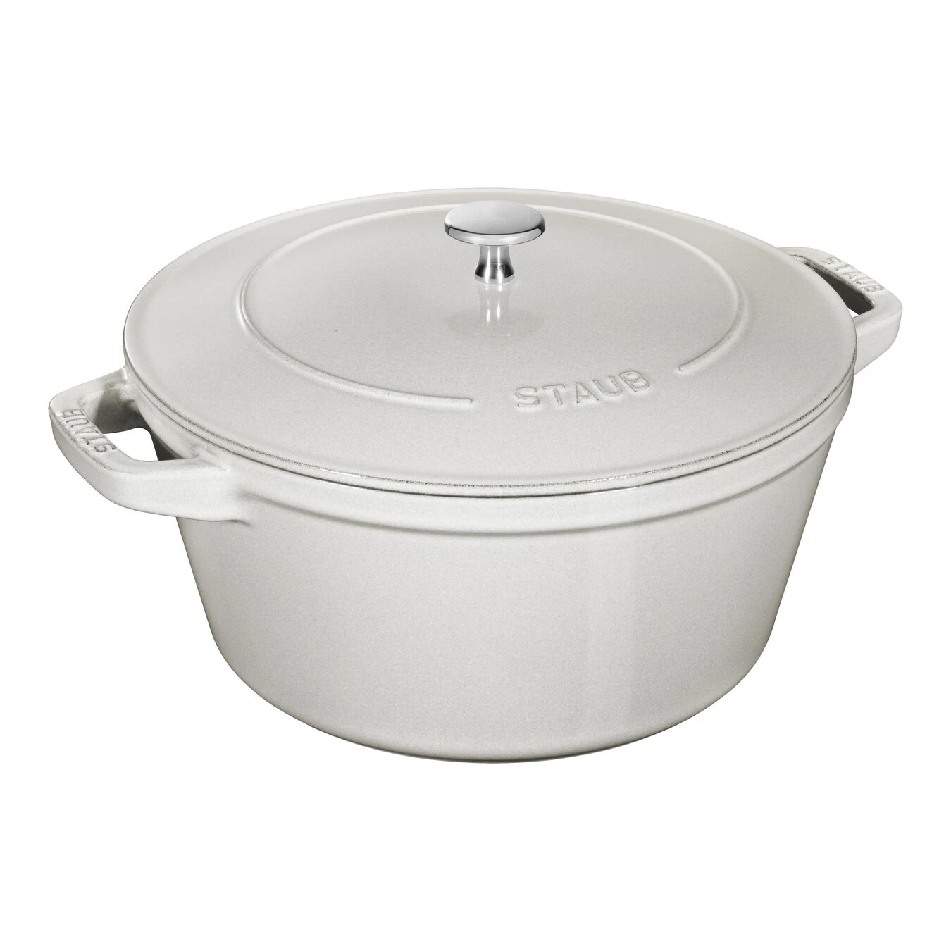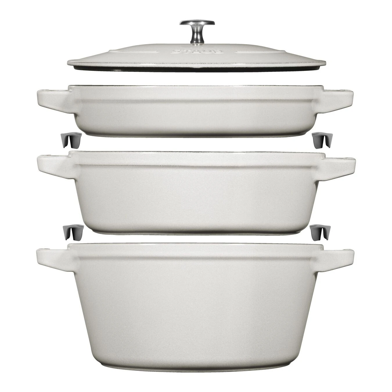 Luckily, you don’t have to decide. STAUB put together a set consisting of a Cocotte, a braiser and a pan, complete with self-basting lid, that can be easily stacked and fits into every kitchen. The elegant white truffle colour, named in honour of the exclusive ingredient French chefs love, makes the cast iron products a highlight on the table, where they keep the food hot for a long time.