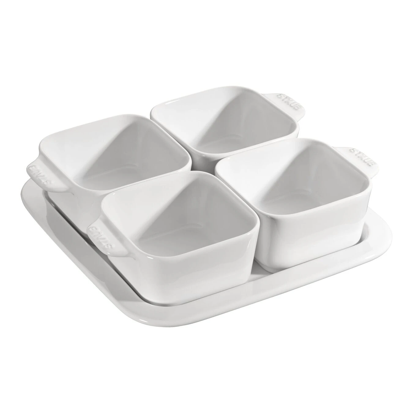 The tapas set from the Ceramics range is for serving Mediterranean tapas and other snack food. The set has a decorative look, making it ideal for parties and other special occasions. The tapas set has a 19 x 19 cm plate as a base. This holds four small dishes, each measuring 8 cm, for serving and presenting the tapas. With the tapas set from STAUB, you can stylishly serve small delicacies to friends and guests.