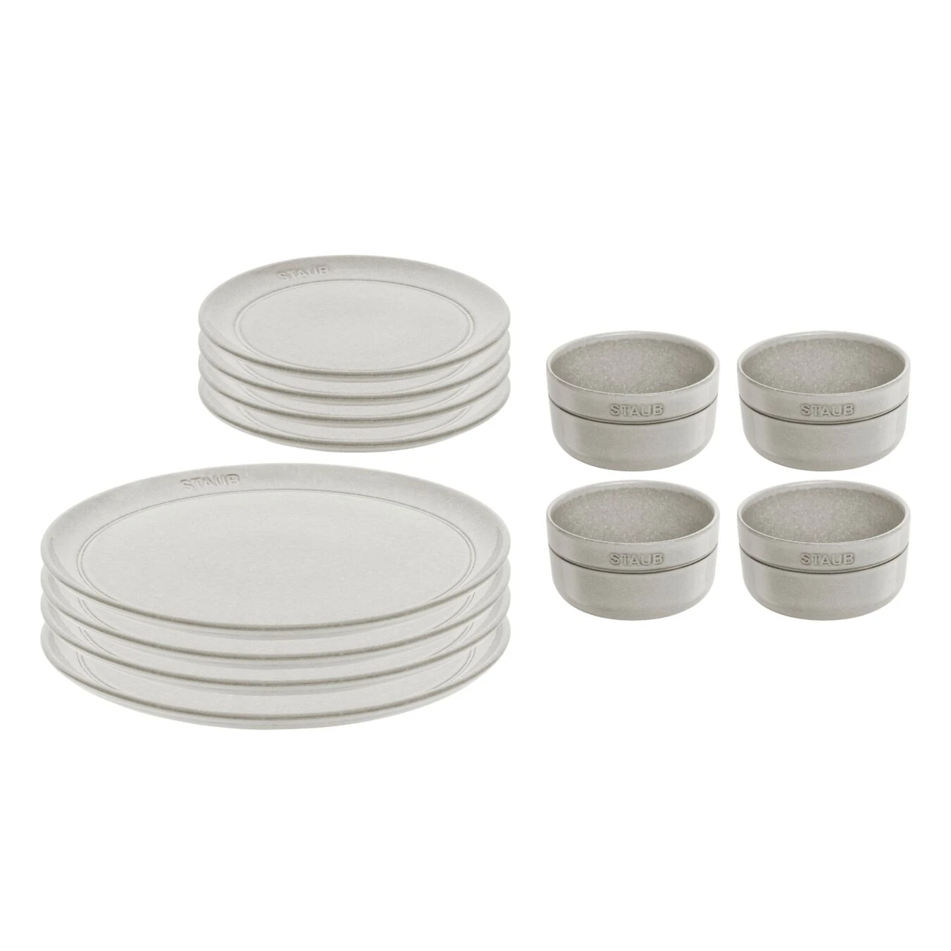 This ceramic dining crockery set consists of 4 26cm dinner plates, 4 22cm side plates and 4 12cm bowls in the colour white truffle, named after the rare and exclusive fungus.